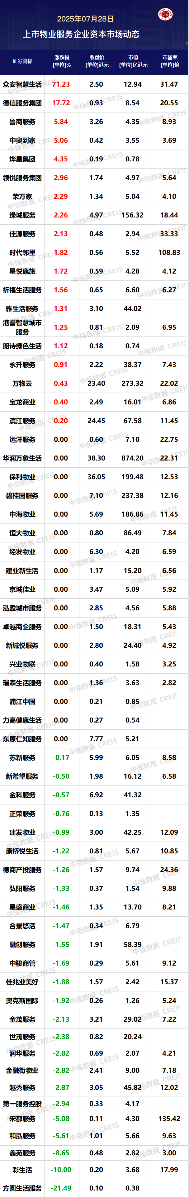 ]article_adlist-->市场研究:https://u.fang.com/yt994g/ ![]() 资本市场动态 ▌物业服务企业二级市场表现 7月28日,恒生指数,收盘上涨173.78点,涨幅约为0.68%,报收25562.13点。今日61家港股上市物业服务企业中19家上涨,众安智慧生活涨幅为71.23%。位列今日港股物业服务板块第一位。 ▌物业服务企业市值、市盈率 7月28日,港股61家物业上市企业平均市值为43.81亿港元。截至今日收盘,共有6家物业服务企业总市值超过百亿港元。华润万象生活为在港上市物业服务企业市值最大的公司,总市值为874.20亿港元,万物云为港股物业股第二,总市值为273.32亿港元,碧桂园服务位列港股物业服务企业总市值第三位,总市值为237.38亿港元。从市盈率来看,港股61家物业上市企业平均市盈率为15.36倍。宋都服务市盈率最高,为135.42倍。 ![]() 物业报告下载(电脑端复制链接) 2025中国物业服务百强企业研究报告 www.cih-index.com/report/detail/97475.html?agentcode=242438 2025中国物业服务上市公司TOP10研究报告 www.cih-index.com/report/detail/99220.html?agentcode=242438 2024中国物业管理行业市场总结&2025趋势展望 www.cih-index.com/report/detail/90254.html?agentcode=242438 2024中国物业服务百强企业研究报告 www.cih-index.com/report/detail/85385.html?agentcode=242438 2024年中国房地产服务品牌价值研究报告 www.cih-index.com/report/detail/83411.html?agentcode=242438 2024年中国物业服务价格指数研究报告 www.cih-index.com/report/detail/90236.html?agentcode=242438 2024物业上市服务公司ESG测评研究报告 www.cih-index.com/report/detail/90235.html?agentcode=242438 物业管家发展白皮书 www.cih-index.com/report/detail/71710.html?agentcode=242438 中指研究院官网·中指云平台 www.cih-index.com 为行业提供: ●4万+房地产报告每日更新,涵盖住宅市场、房企研究、土地市场、物业研究、政策解读、指数研究等诸多领域; ● 2300个城市地产数据、225万宗土地的推出成交信息、40万个住宅项目和5万栋商用物业的交易数据; ●中国城市投资吸引力排名,百城房价,查城市、查房企、查地产数据、查房地产政策; ●京津冀、长三角、珠三角、成渝、长江中游等核心城市群集中供地、土地拍卖快讯。 ![]() 戳“阅读原文” 免费试用中指产品散户配资 ]article_adlist-->